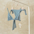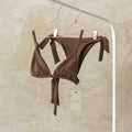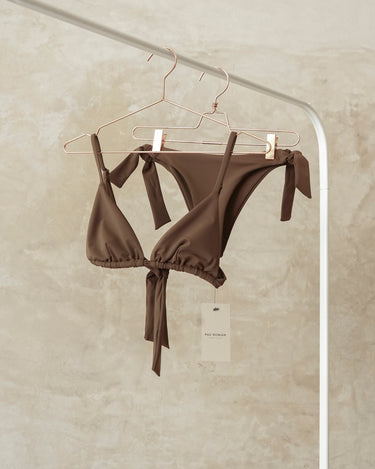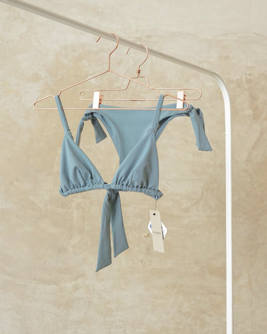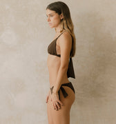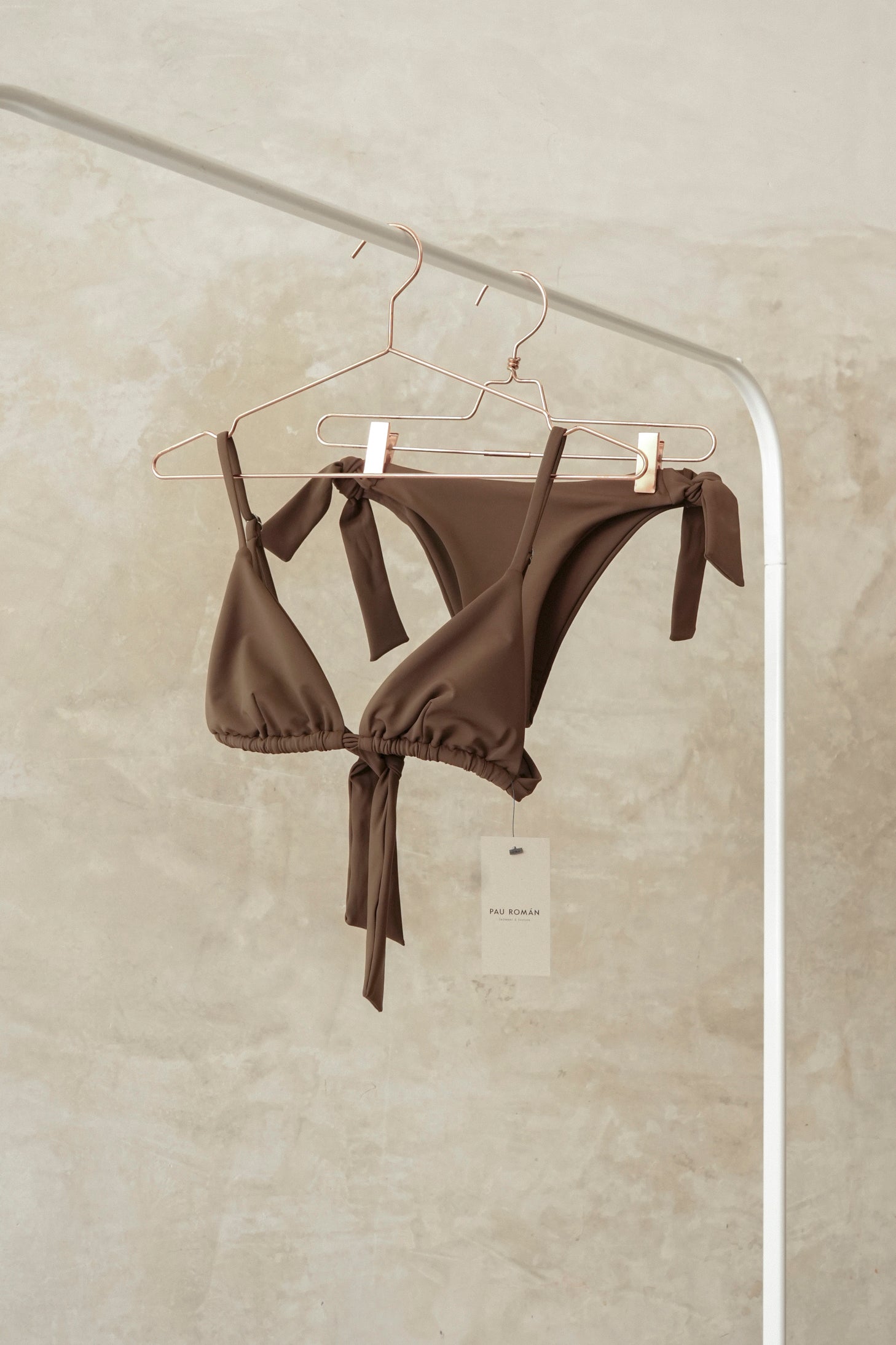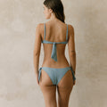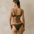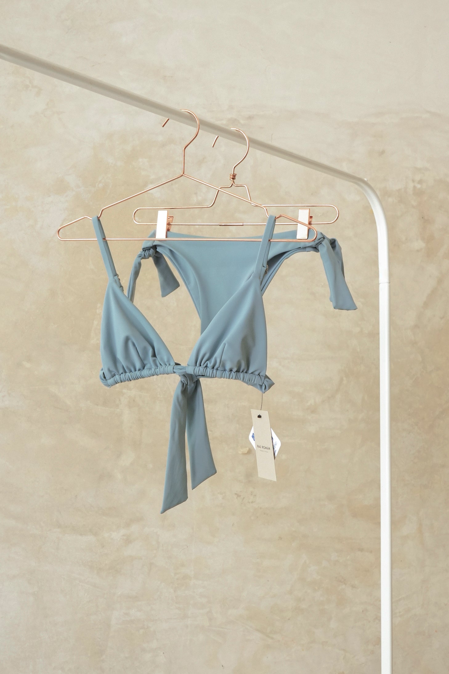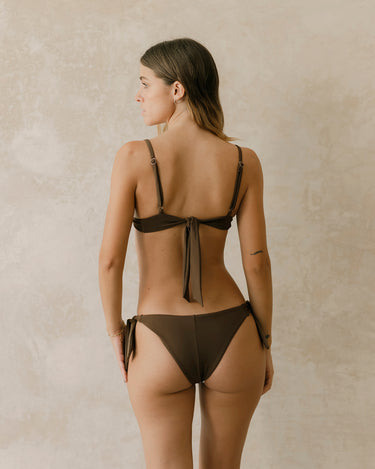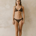 El bikini Naica es de silueta triangular clásica, tiene tirantes delgados y ajustables. La tira de abajo del busto al ser gruesa da un suporte perfecto. El bottom es low waist de cobertura media y se amarra a los costados.