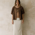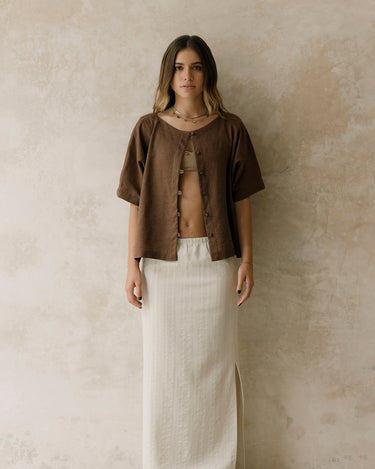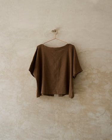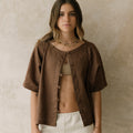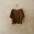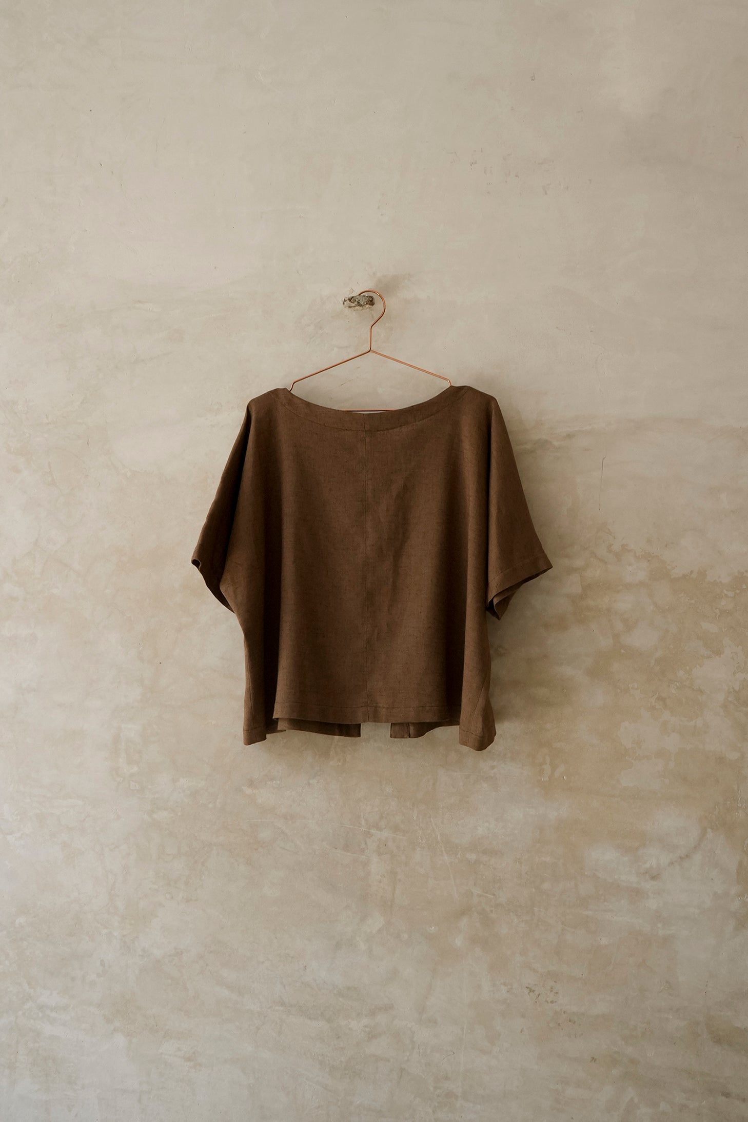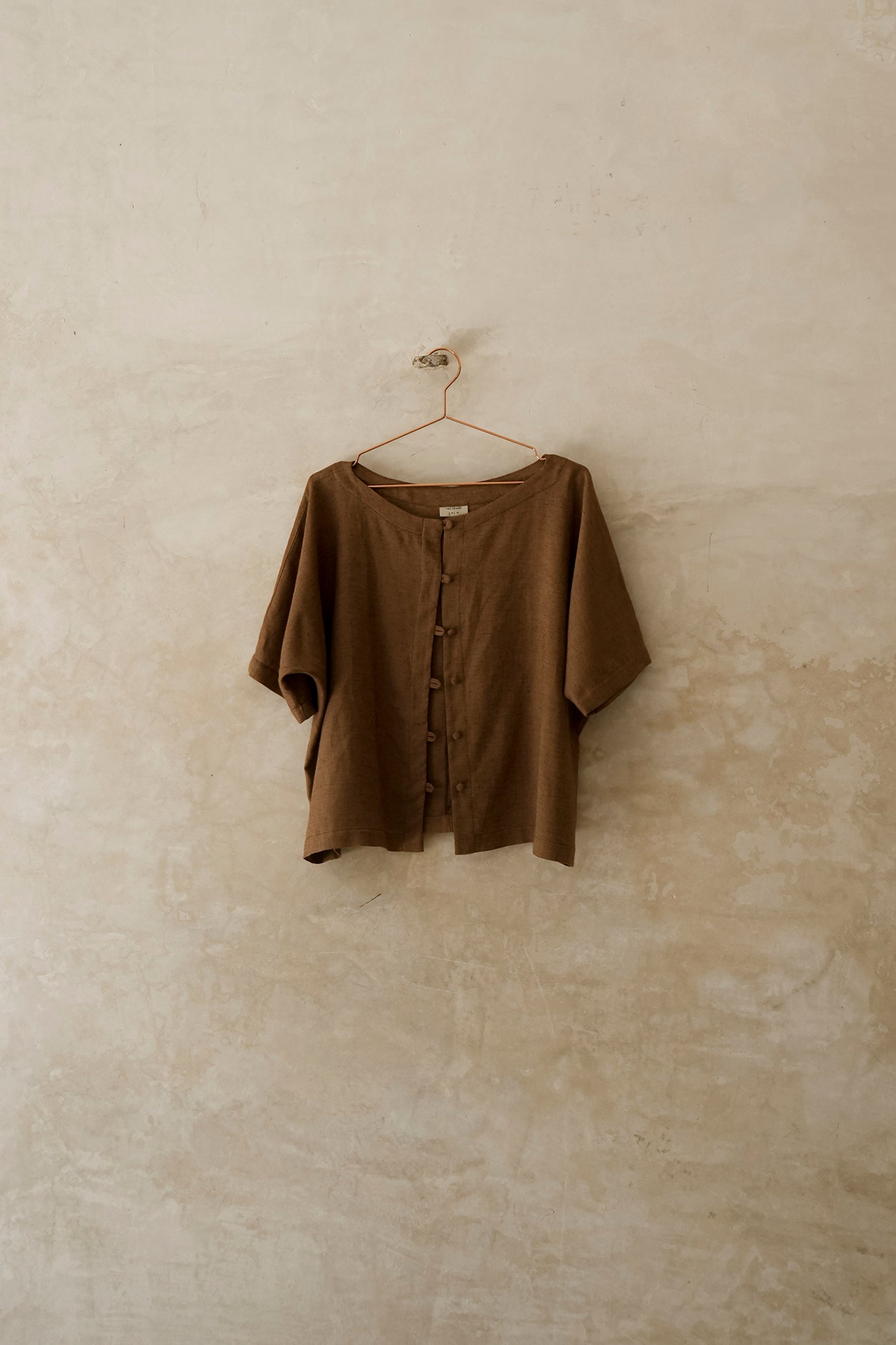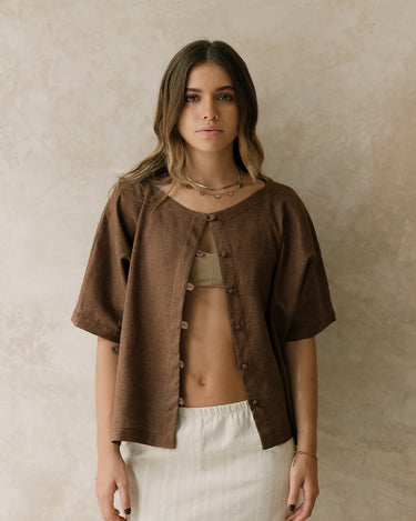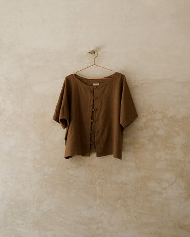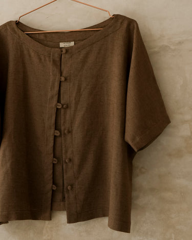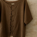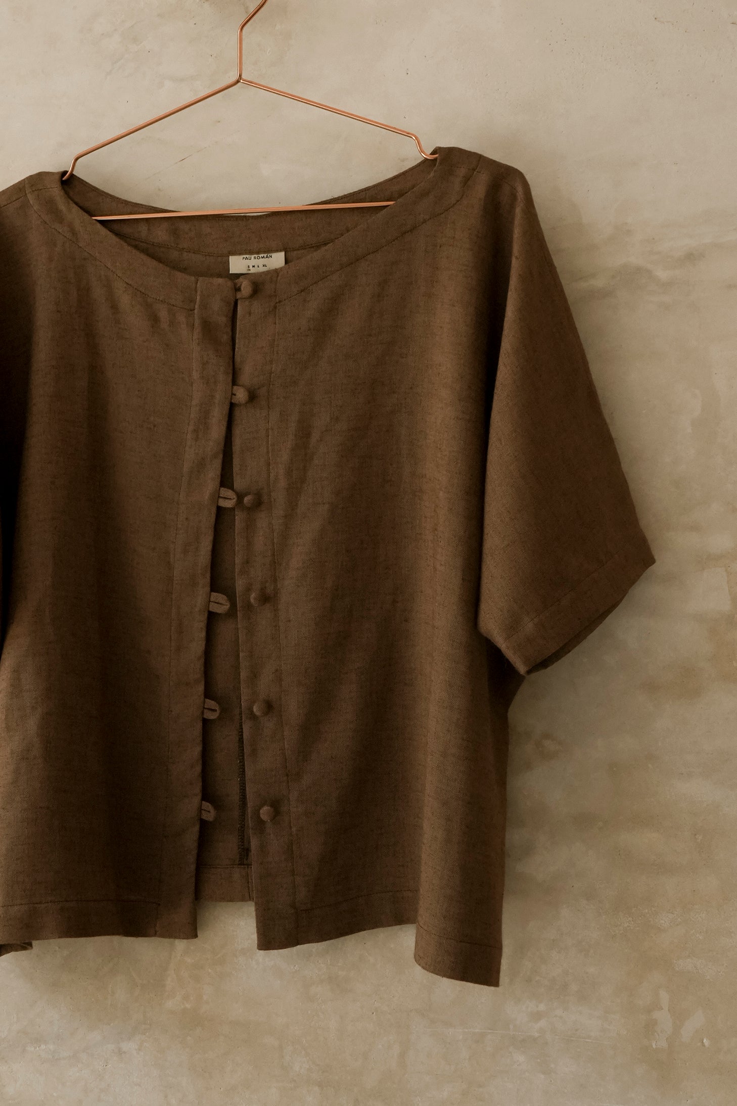 Blusa oversize, con cuello ojal y manga japonesa. Tiene botones forrados. Es una pieza cómoda y versátil.