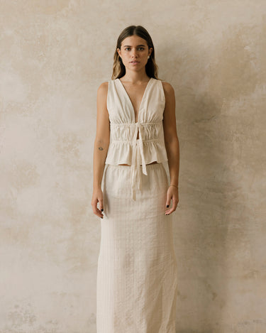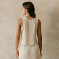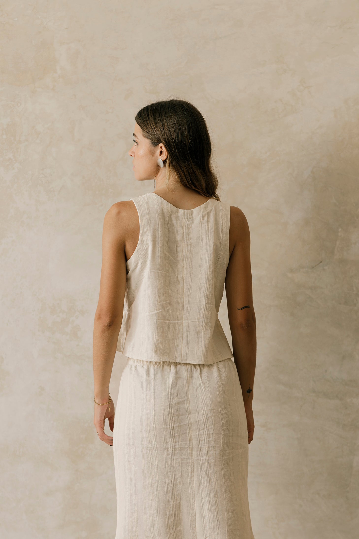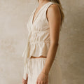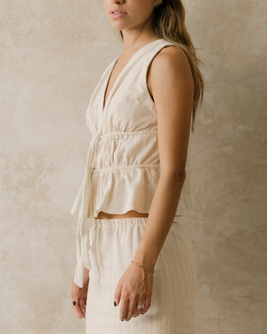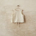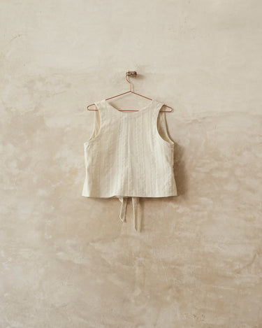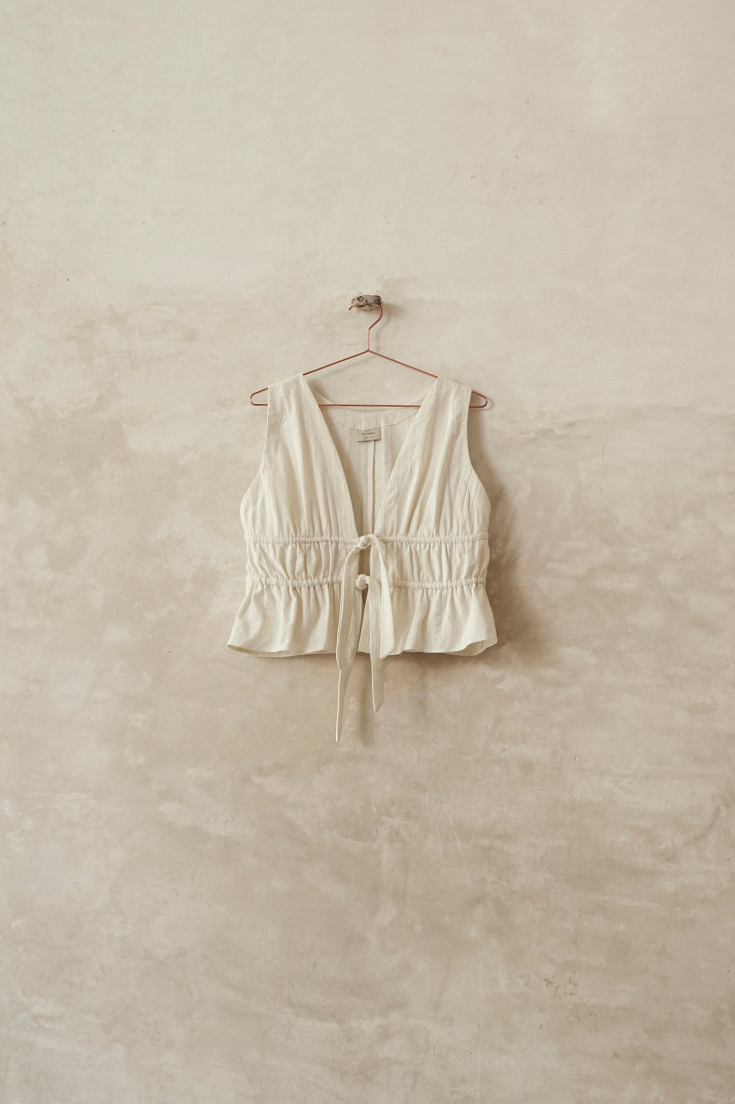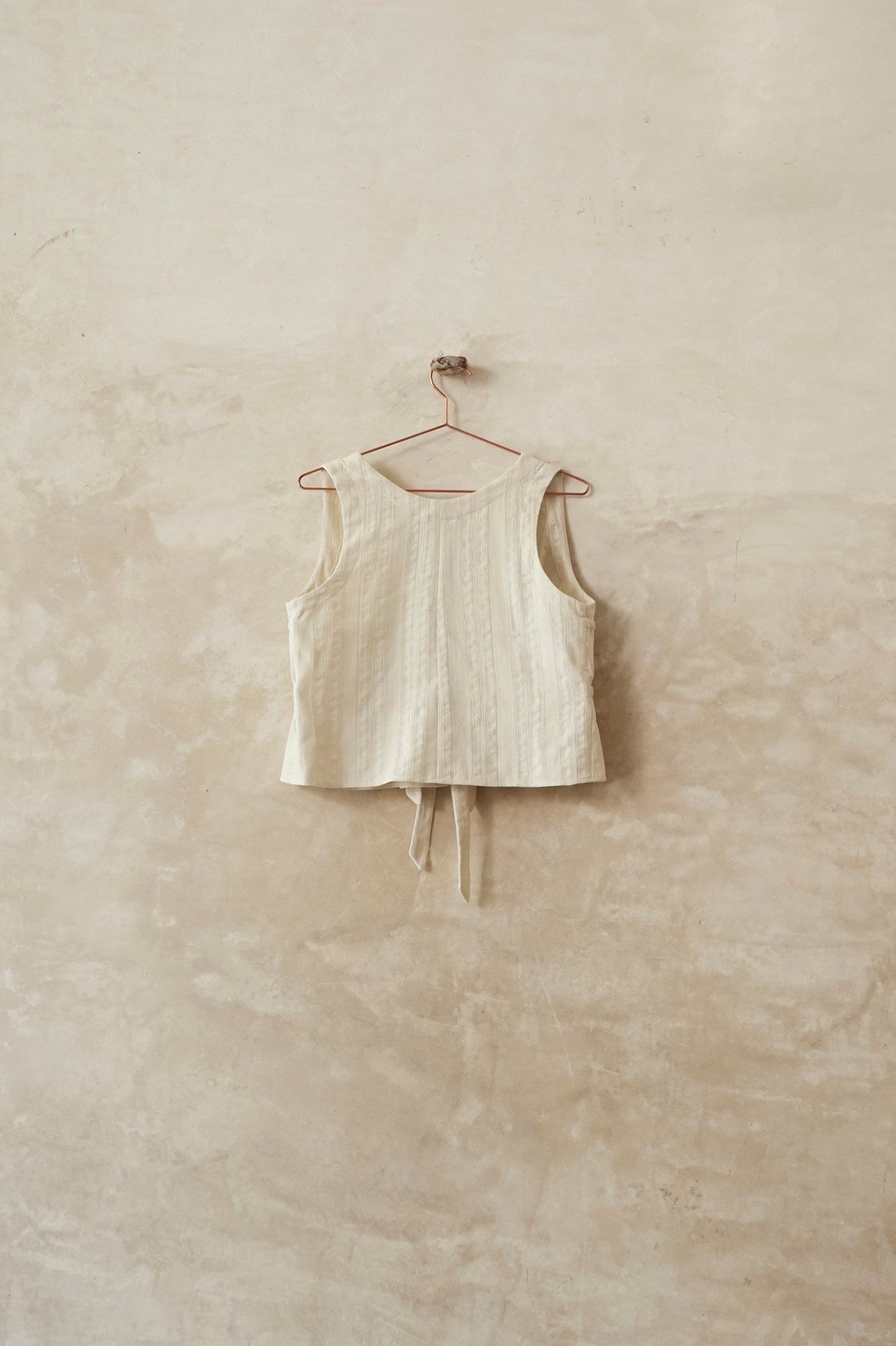 Elegimos una tela 100% algodón con un tejido único. Es cómodo y fresco. Este top se amolda al cuerpo con las dos jaretas debajo del busto.