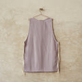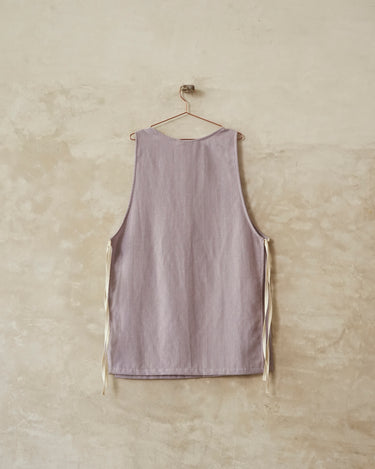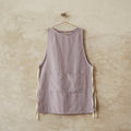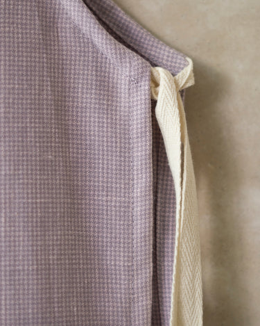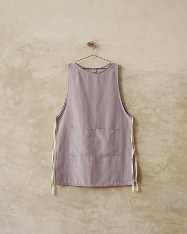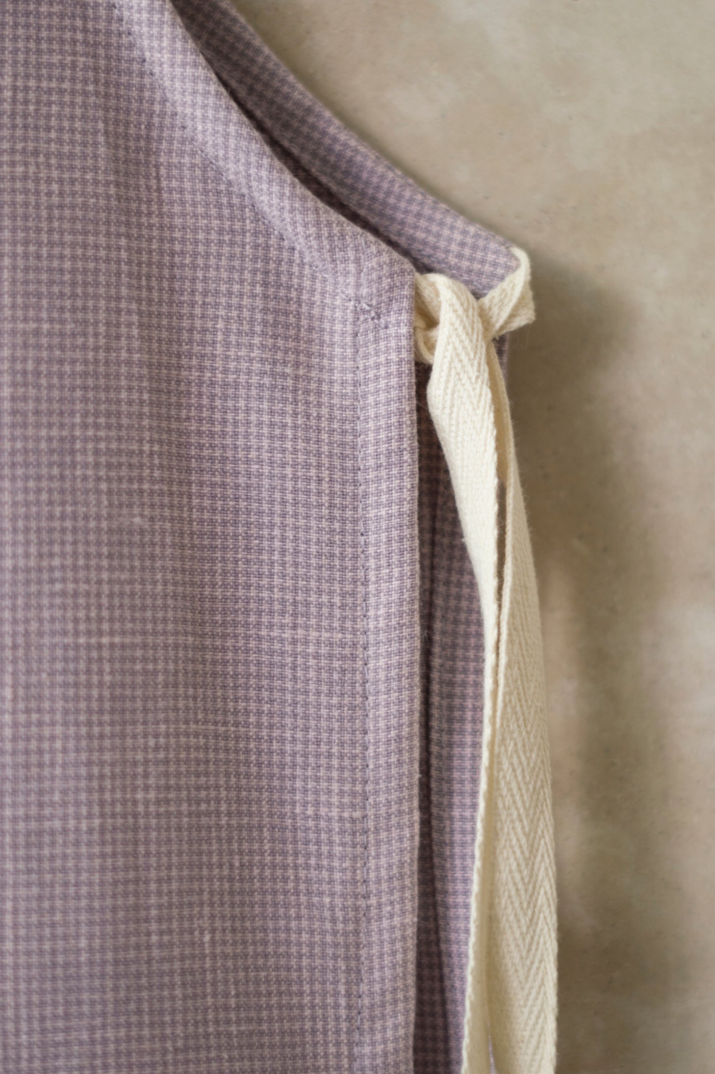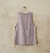 Un mandil súper versátil, está hecho con tela de lino en color lila y es ideal para usar en cocina, jardinería, pintura. Nos encanta que se puede amarrar a los costados, adelante o atrás.