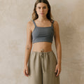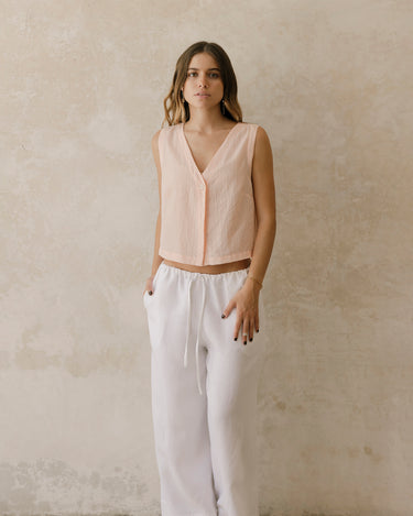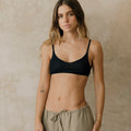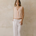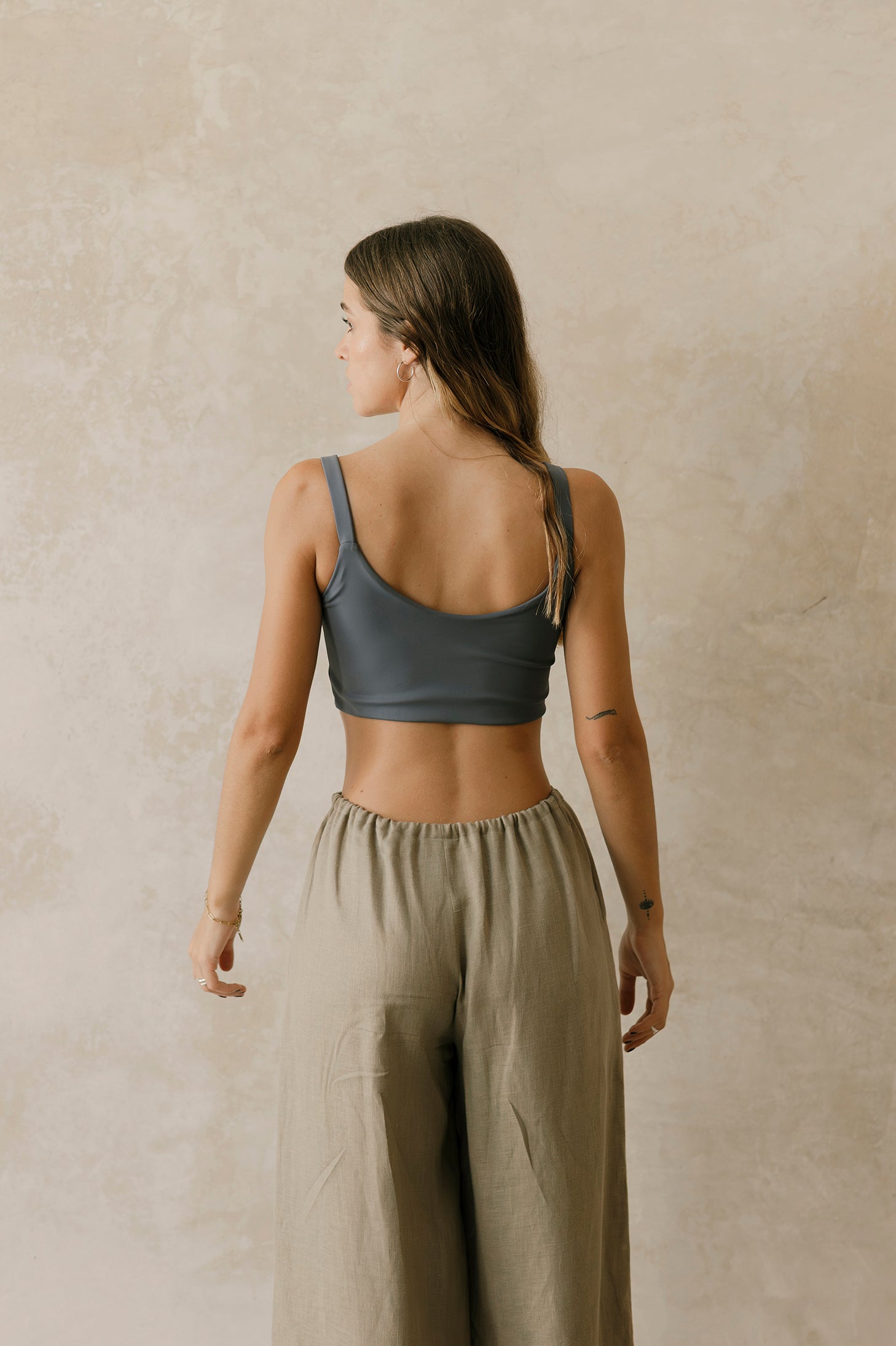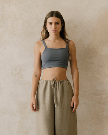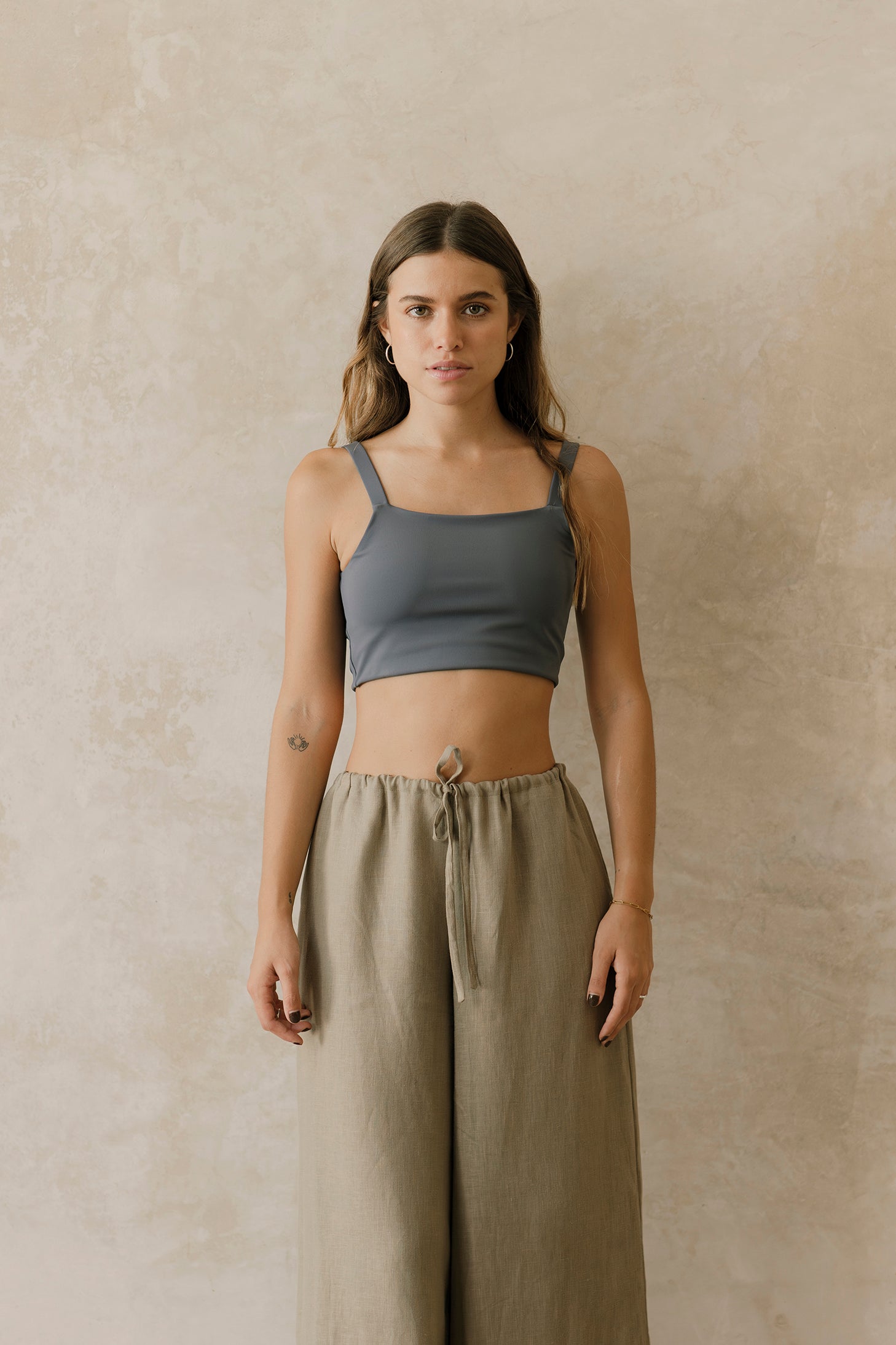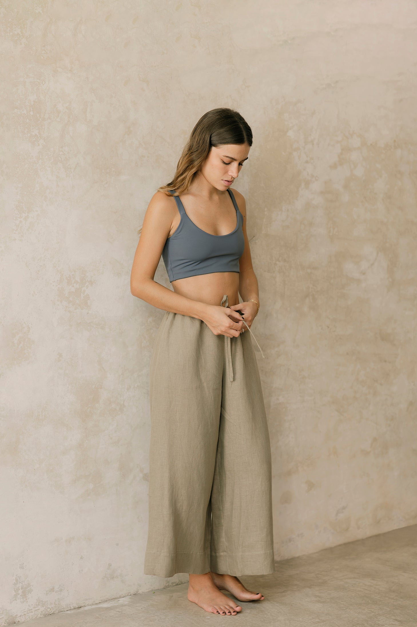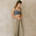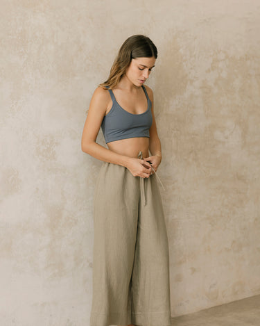 El pantalón Montejo es largo de silueta amplia y fluida. Su cintura elástica suave tiene una jareta delgada para ajustarlo y tener mejor comodidad.